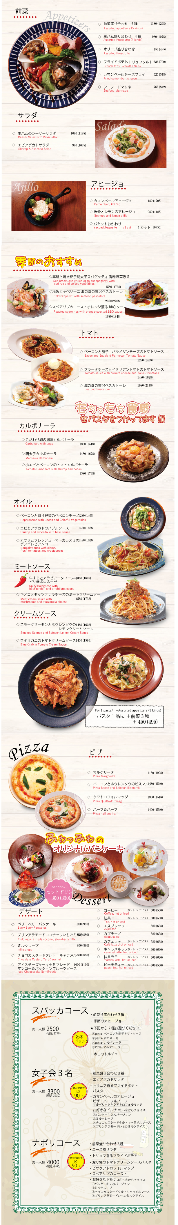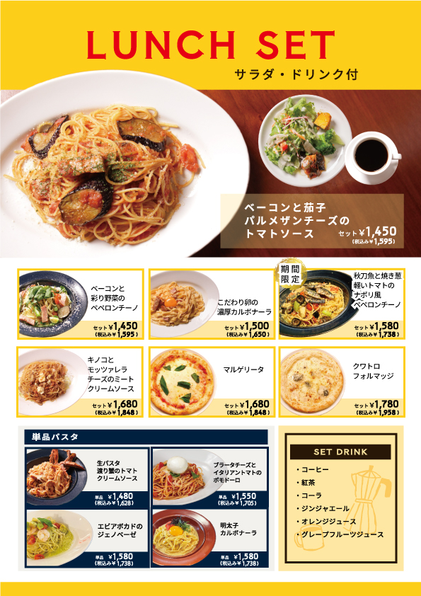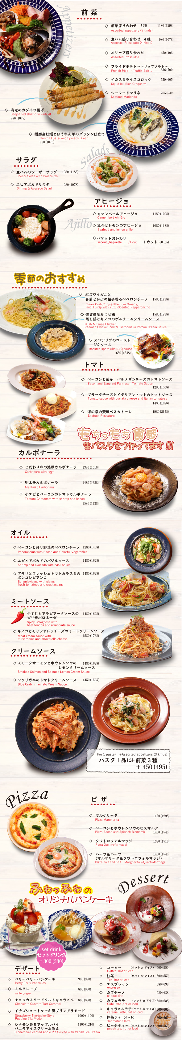 2025.10..1 メニュー替えしました! 秋のおすすめパスタ・ピザ・デザートが登場しております。 是非、お出かけの際は、ルクア10Fスパッカアルバータにお立ち寄りください。 |