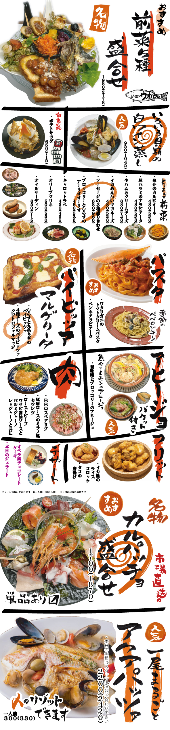イタリアン魚酒場ALBERTA ホワイティうめだ では、日本全国から届く新鮮な魚介類や、当日買い付けた新鮮な 地魚や旬魚を使って料理を提供致します。店名のごとく『魚酒場』です At the Italian fish bar, ALBERTA NAMBA offers dishes using fresh seafood from all over Japan and fresh ground fish and seasonal fish purchased on the day competition (seri). As the name of the store is "fish bar"
